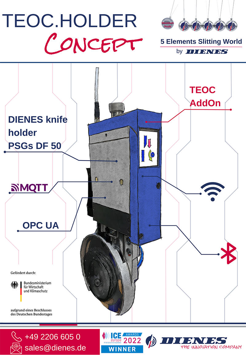 DIENES wurde mit dem diesjährigen ICE-Award in der Kategorie „Digital Converting Solutions“ für sein TEOC „AddOn“ ausgezeichnet, welches Bestandteil des in München vorgestellten TEOC.Holder CONCEPTs ist. TEOC, kurz für „The end of coincidences“, steht für DIENES neue Marke im Segment Industrie 4.0. Das TEOC „AddOn“ für Messerhalter ist die neuste Entwicklung von DIENES. Die Integration von Elektronik, Sensorik und Konnektivität ermöglicht ein Upgrade von konventionellen Messerhaltern auf das TEOC System.